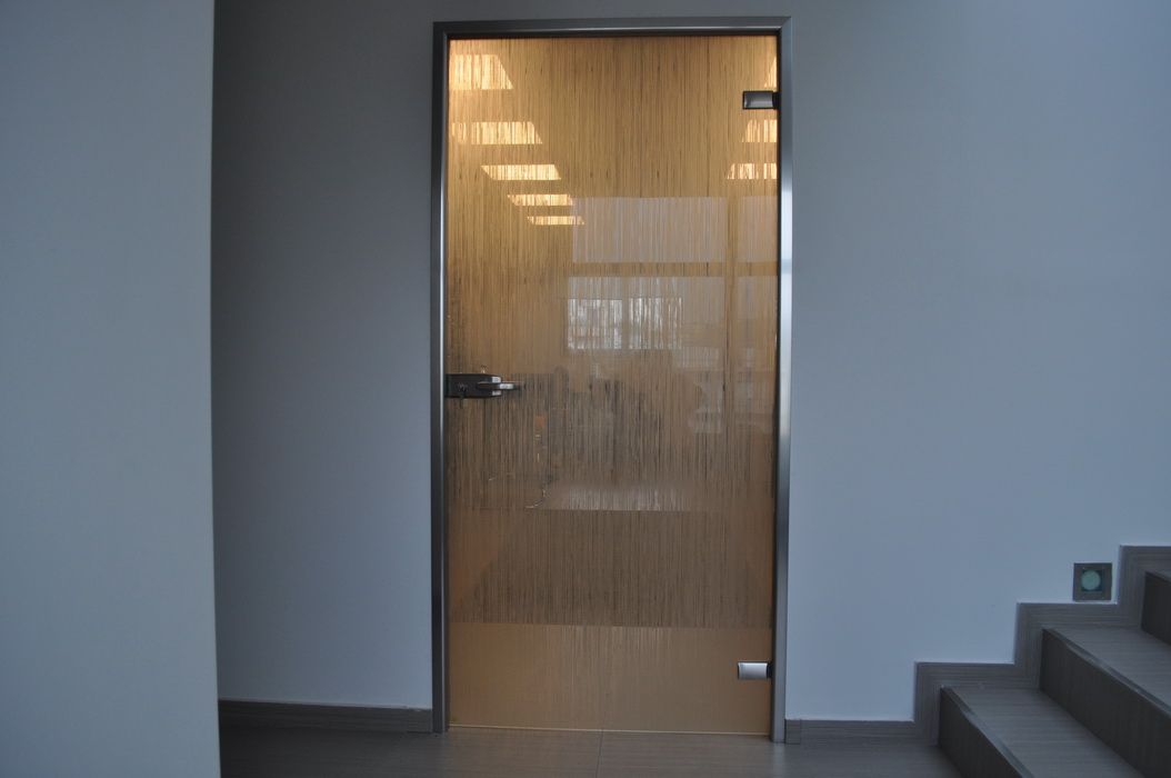 Противопожарная безрамная дверь со стеклом в БЦ в Дмитрове